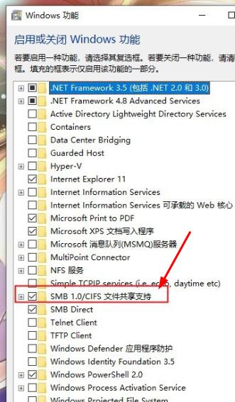 最后找到一個解決辦法,還是比較好的,這里分享給大家:思路就是進(jìn)入“windows功能”界面,找到SMB 1.0/CIFS文件共享支持并勾選,確定,這時會自動安裝,然后點擊重啟。操作方式如下: